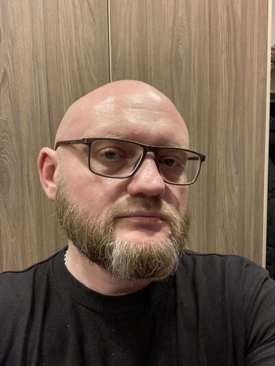Лысый, толстый бородатый очкарик